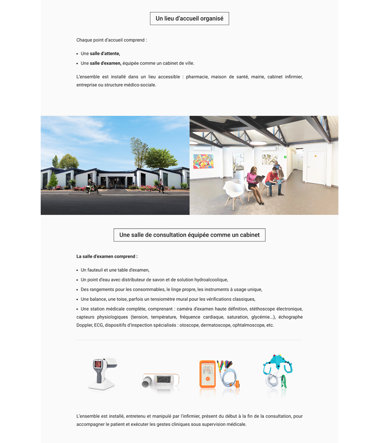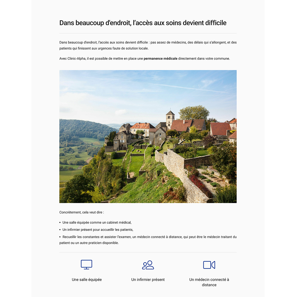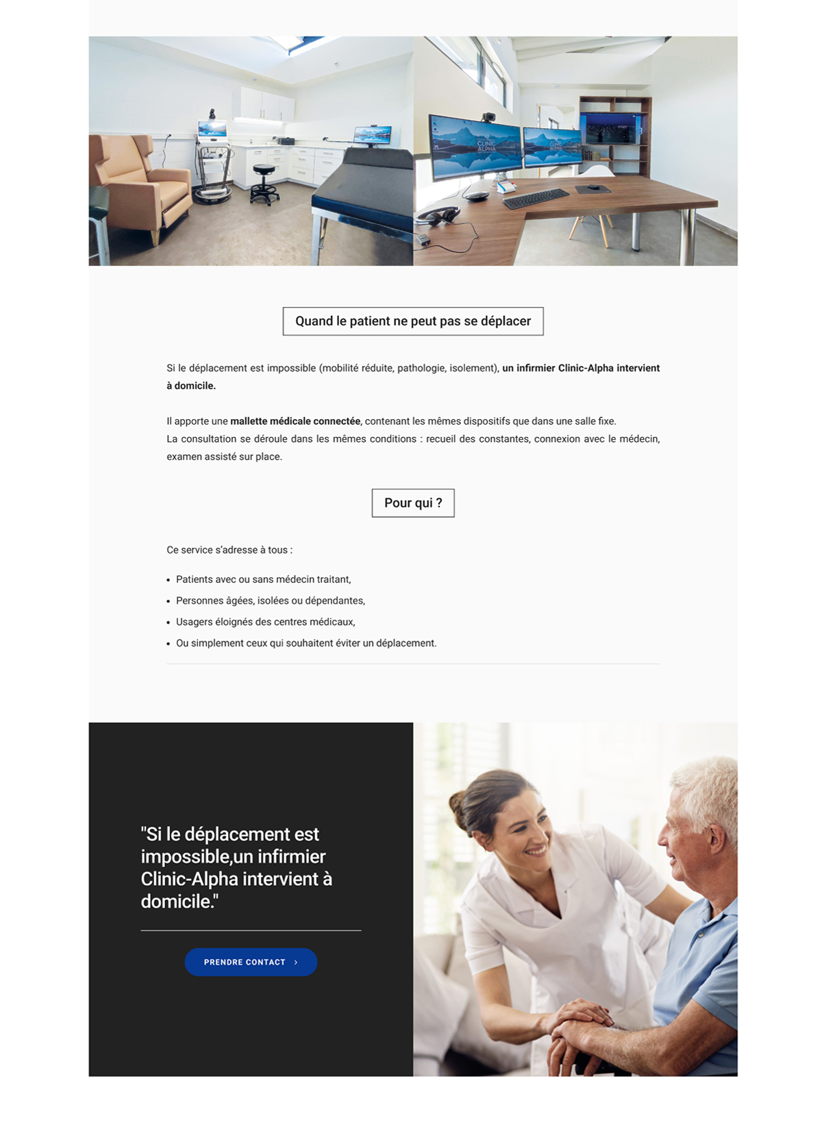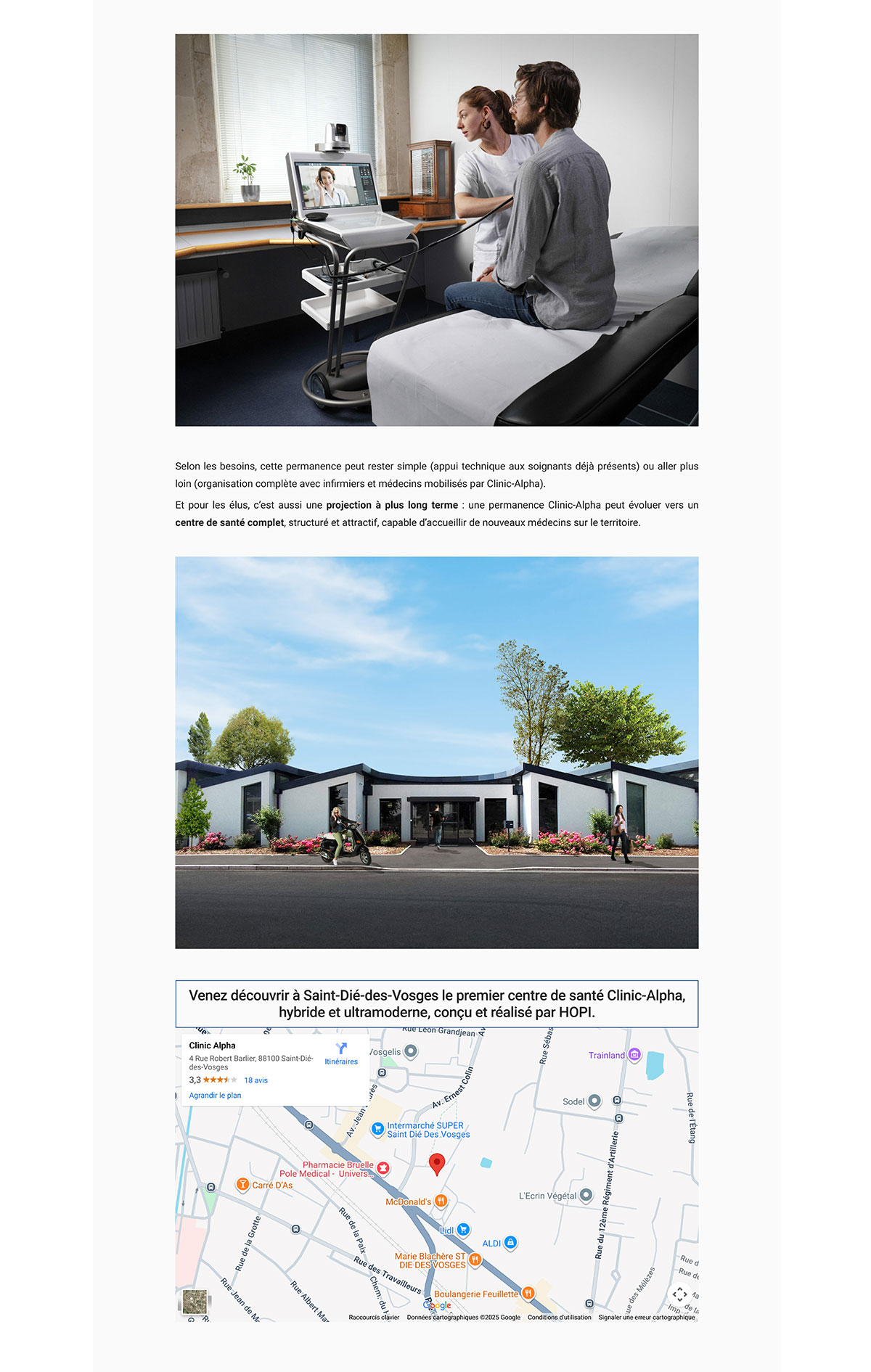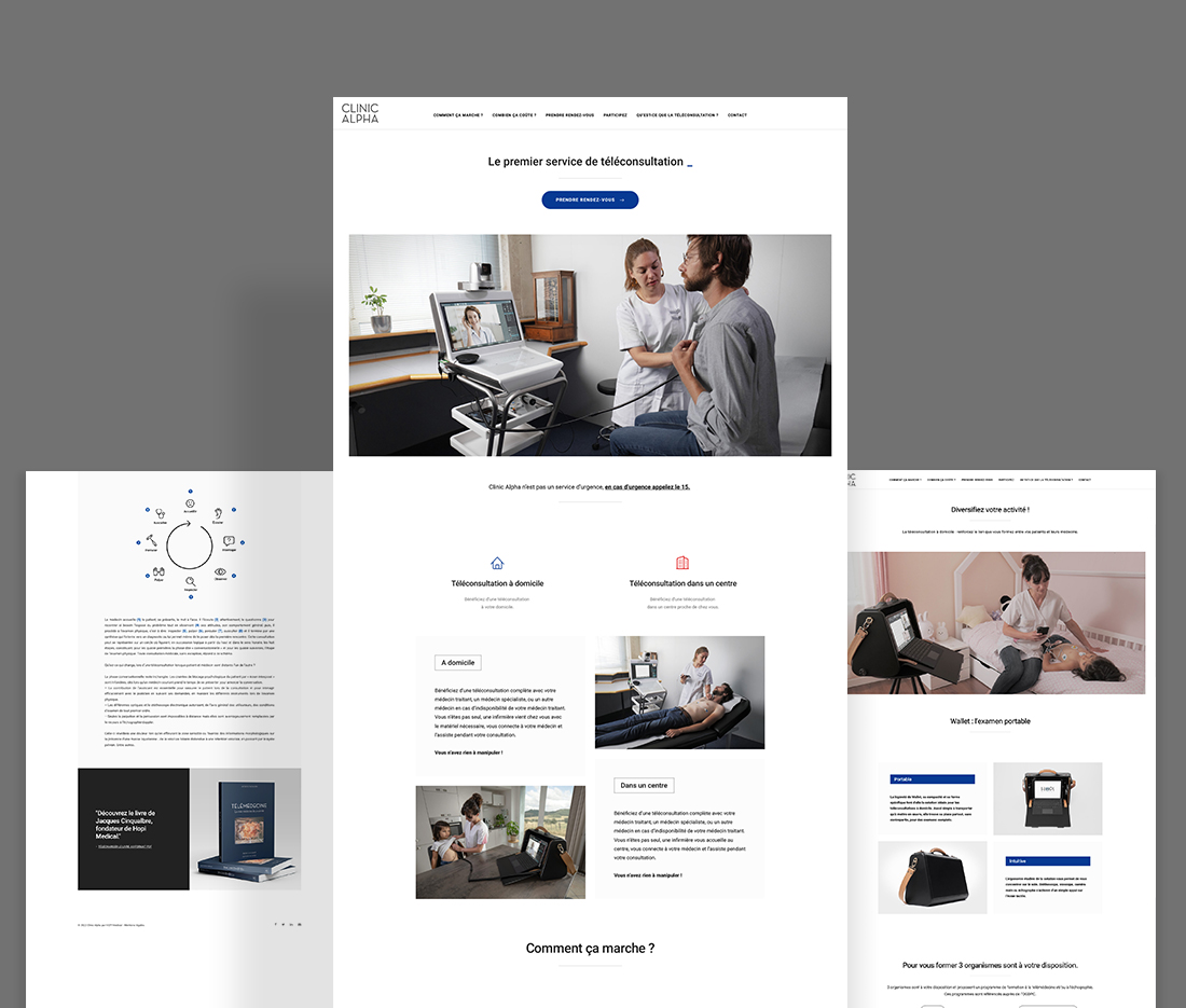 Spécialiste des matériels et des logiciels de téléconsultation, Hopi Medical, a été fondé en 2005 à Strasbourg et implanté à Nancy. Le remboursement des consultations à distance permet à la PME de huit salariés de sortir des dispositifs expérimentaux et des protocoles dérogatoires pour déployer sans contrainte ses chariots et malettes de télémédecine. À l’occasion de la refonte de l’interface du site Clinic Alpha, l’établissement recherchait un product designer freelance pour les accompagner dans la conception et l’optimisation de l’expérience générale du service. Responsive design l’interface s’adapte automatiquement à une consultation sur téléphone mobile et tablette.