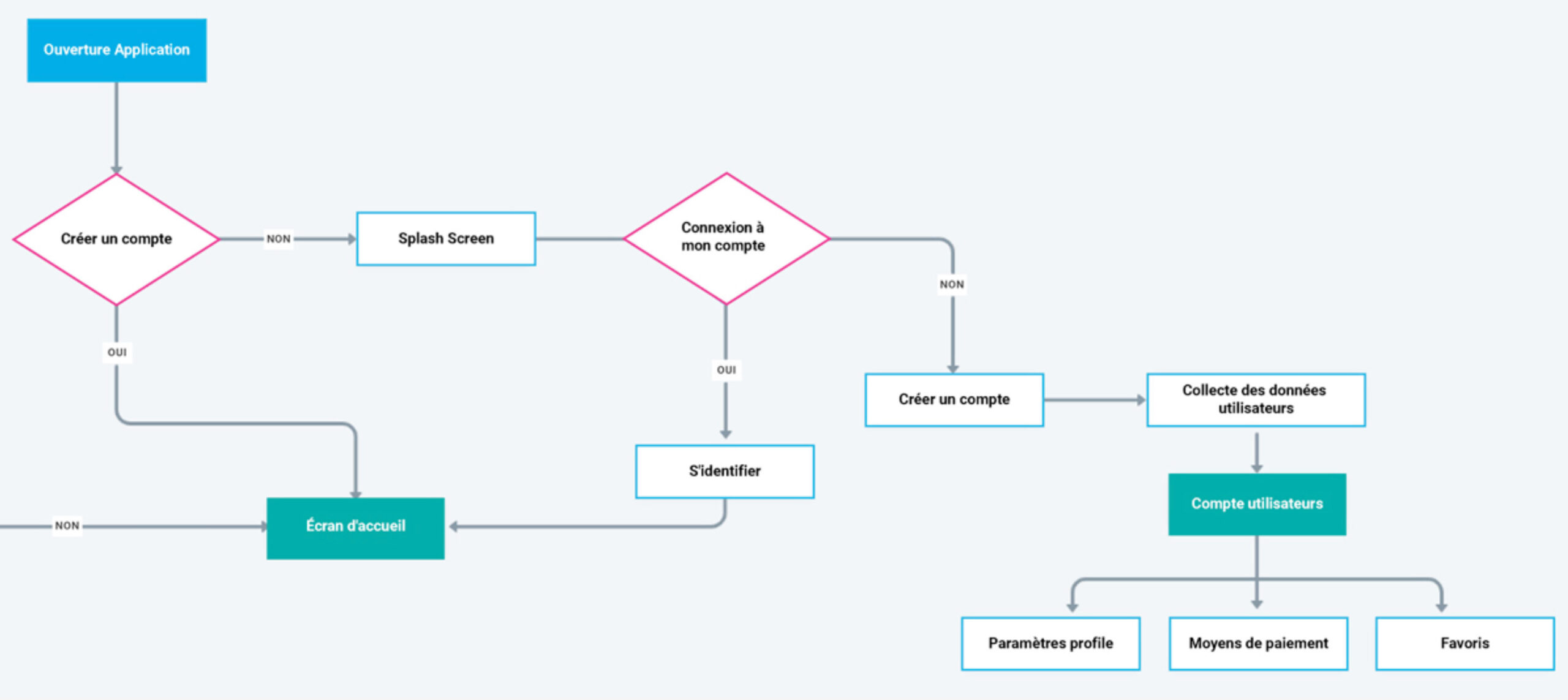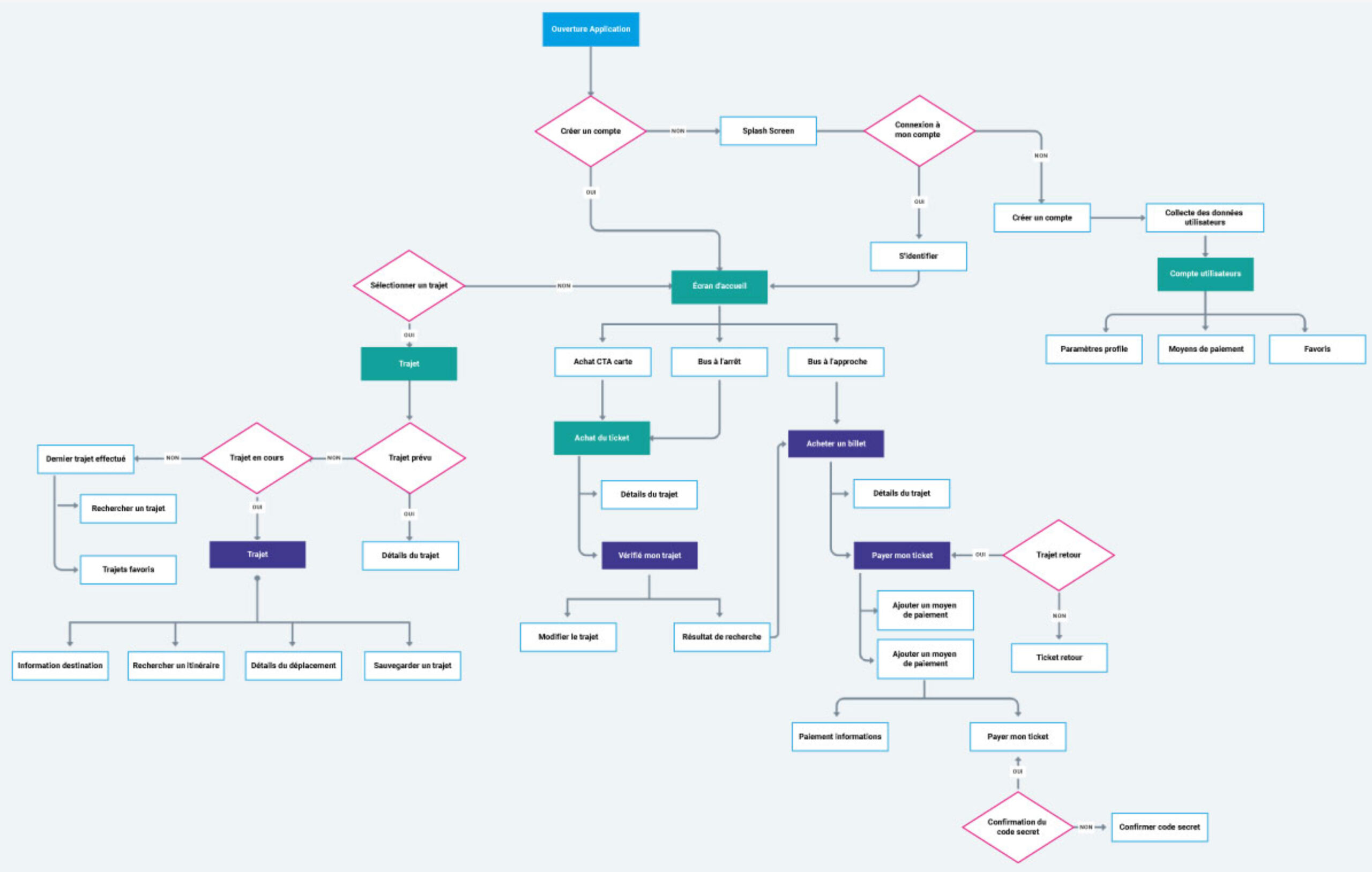 L’étape user flow était incontournable lors de la phase de modélisation de l’architecture et de l’UI Design du produit. Nous avons cherché à fluidifier l’interface pour permettre à l’utilisateur d’atteindre plus rapidement son objectif. Nous voulions visualiser les points de décrochage, les freins dans la navigation et apporter des correctifs immédiats afin de proposer une version adaptée aux réalités d’usage, mais également communiquer avec les différentes équipes de développement.