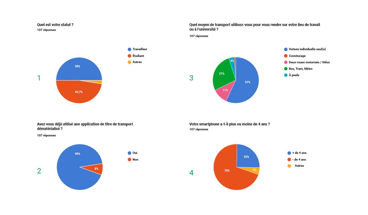 Une étape survey était incontournable lors de la phase de modélisation de l’architecture du produit et nous a aidés à prendre des décisions pour faire évoluer l’offre de transport. Par l’intermédiaire de formulaires Google, afin de comprendre comment se déplacent les usagers mais également envisager au mieux les technologies à prendre en compte (NFC, QRCode, Bluetooth) dans la conception d’une application de titres de transport dématérialisés.